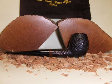 Here is your chance to get a Frame's Freehands Sandblasted Freehand Apple Shape With Vulcanite Stem. Made from Algerian Briar. Outer Bowl Dia. W 1.460" H 1.736" Inner bowl Dia. W .752" Depth 1.406" over all length 6" It is stained with Ebony and Mahogany stain. The Bowl is precarbonized to ease the break in process. Come with a pipe pouch.