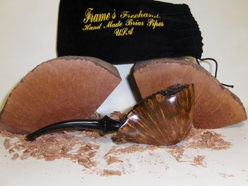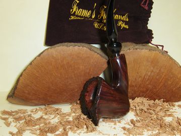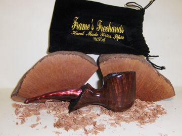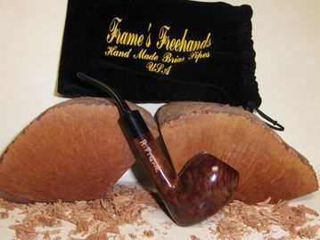 Here is your chance to get a Frame's Freehand Danish Style Freehand Pipe With Vulcanite Stem. Outer bowl Dia. W 1.637" H 1.869" Inner bowl Dia. W .835" Depth 1.350"over all length 7" Weight 1.894 oz it is stained with Red Mahogany. Made from Algerian briar. Bowl is precarbonized to ease the break in process.