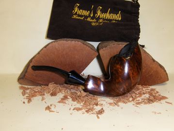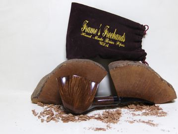 Here is your chance to get a Frame's Freehand Danish Style Freehand Pipe With Vulcanite Stem. Outer bowl Dia. W 2.159" H 2.084" Inner bowl Dia. W .931" Depth 1.474"over all length 7" Weight 2.779 oz it is stained with golden oak. Made from Algerian briar. Bowl is precarbonized to ease the break in process.